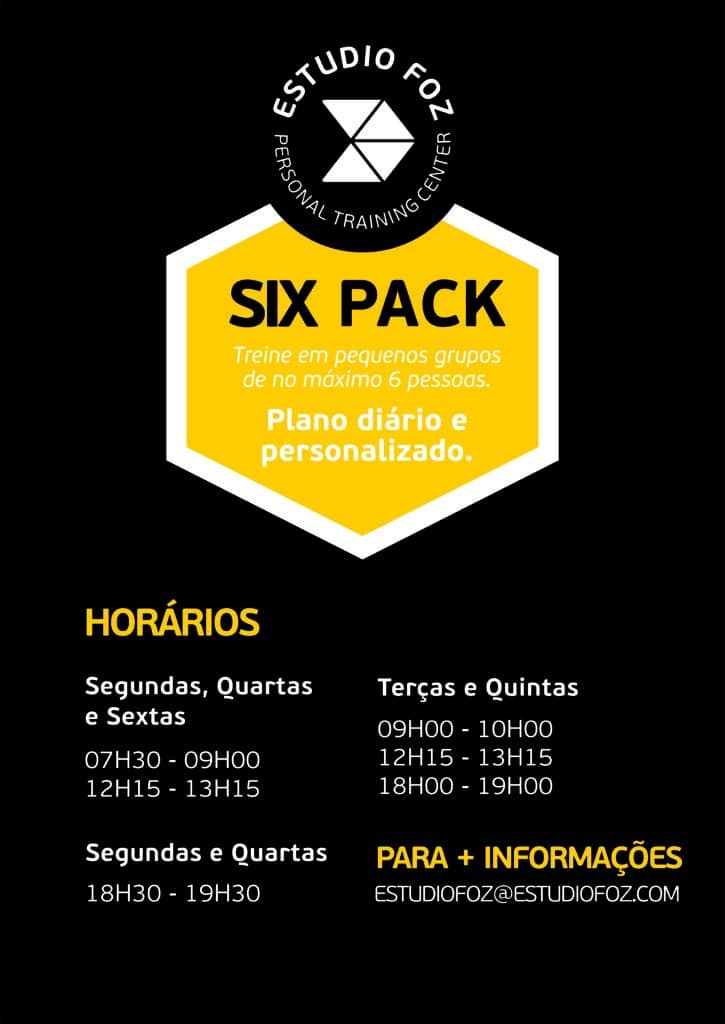 six pack Programas de treino específicos elaborados cuidadosamente pelo nosso grupo de professores e terapeutas, realizados individualmente em sistema de “pequenos grupos”. Entrar em Contacto